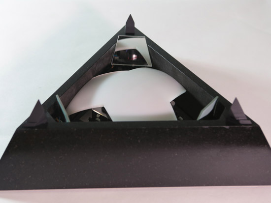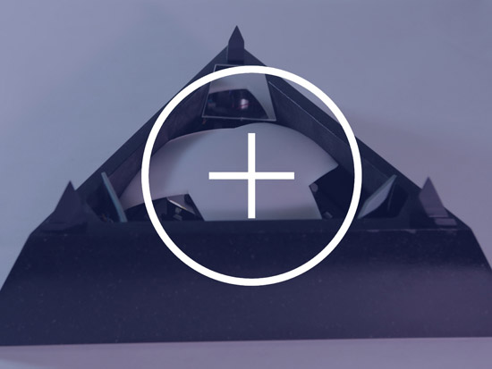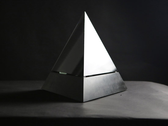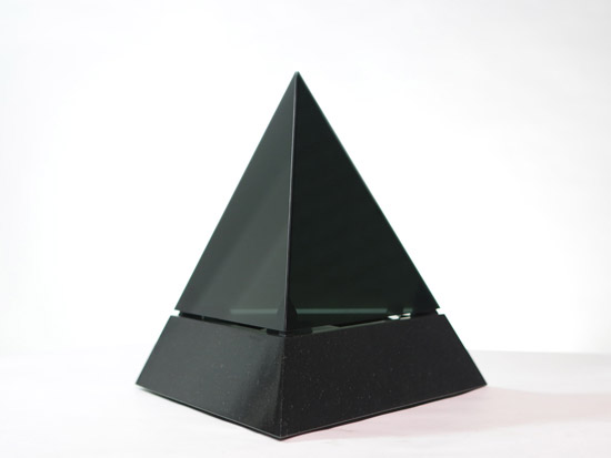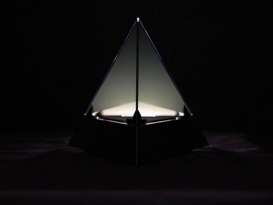 Based on a pure geometrical form, the Tetrahedron combines classic noble materials and modern technology to consolidate a translucent rotating retroprojected device when turned on, and a classical opaque pure form piece when turned off. Premium black african granite base, retroprojectable translucent black tempered glass, 450 lummens retroprojection, 42 adressable SPI RGB Leds...