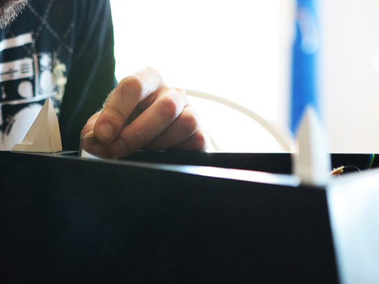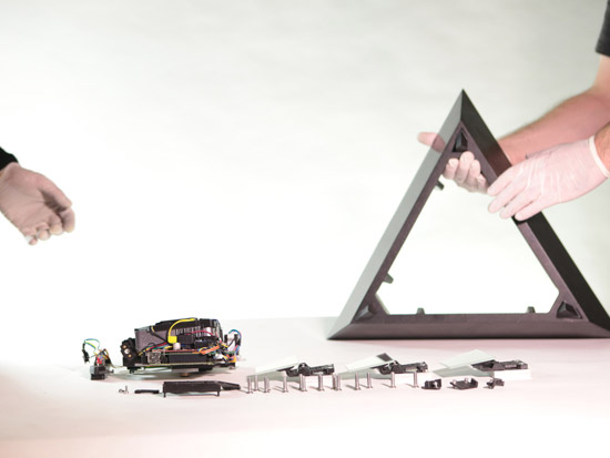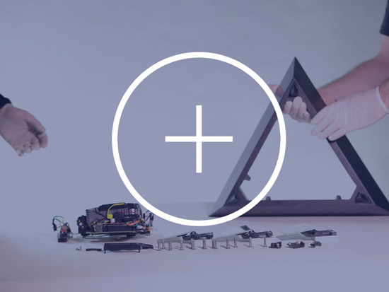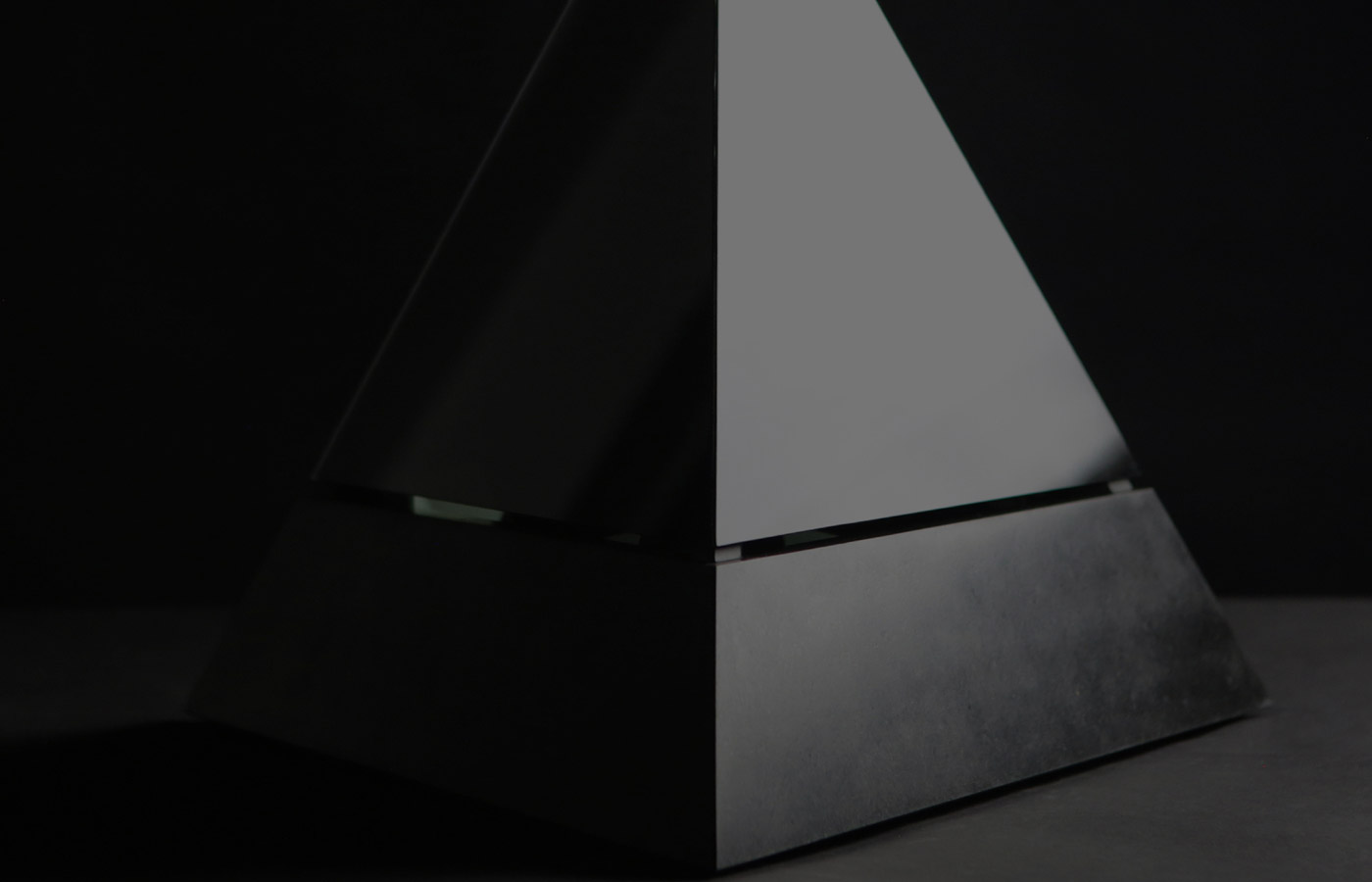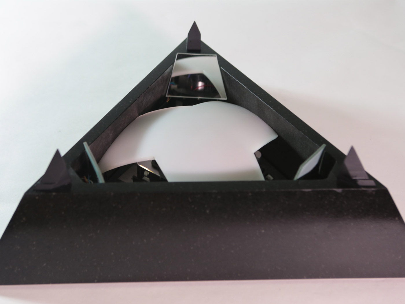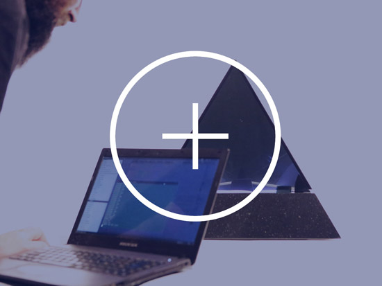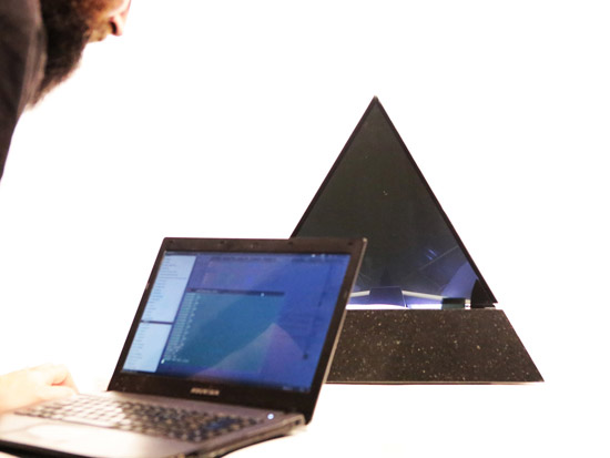 Based on a pure geometrical form, the Tetrahedron combines classic noble materials and modern technology to consolidate a translucent rotating retroprojected device when turned on, and a classical opaque pure form piece when turned off. Premium black african granite base, retroprojectable translucent black tempered glass, 450 lummens retroprojection, 42 adressable SPI RGB Leds, stepper motor, 1080p support, WIFi connection and 2 hours battery autonomy. The piece was a commisioned work and more content and info will be aviable in a near future.